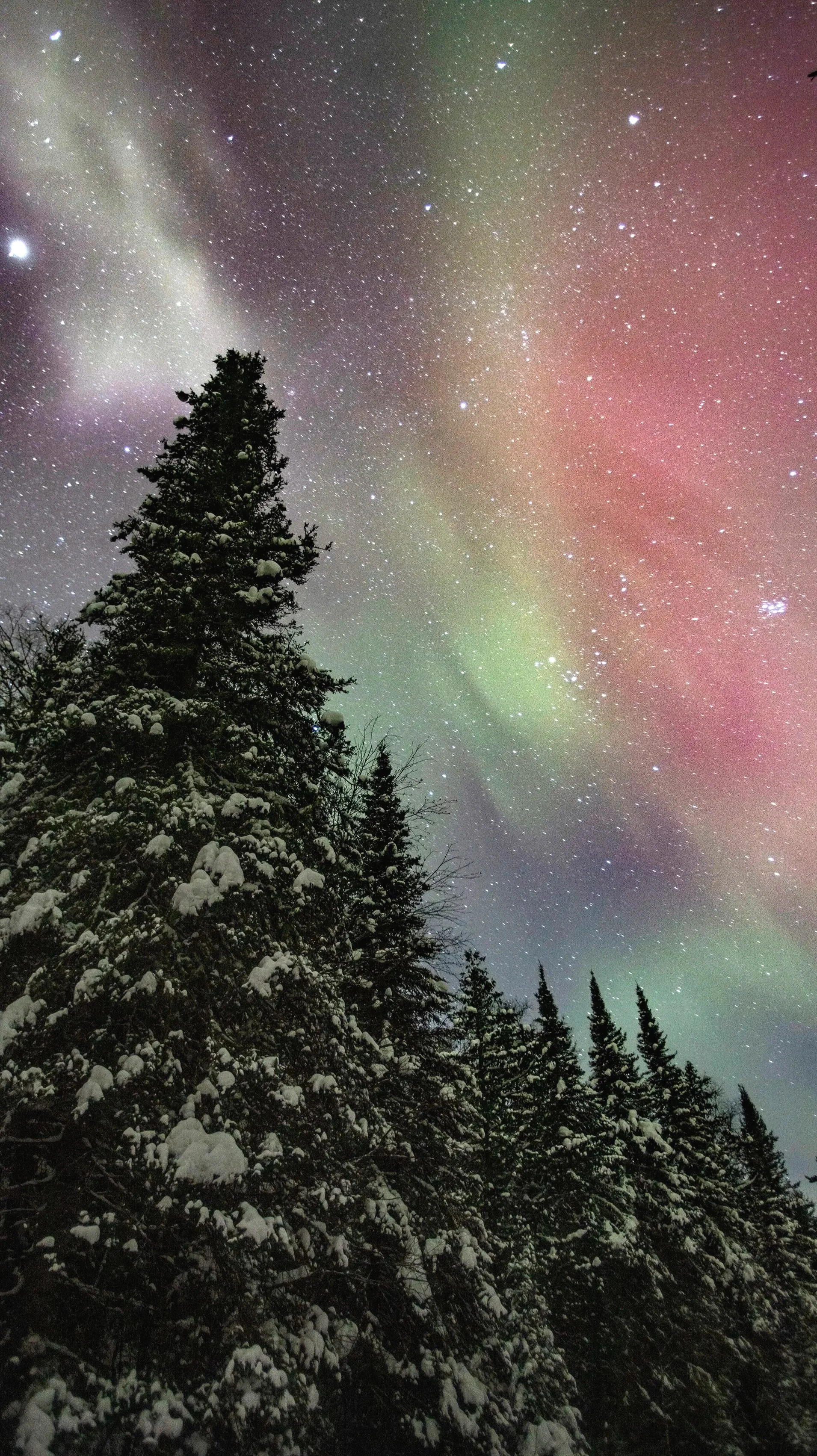 At first, the northern lights were nothing more than a soft breath—barely there, like something the sky was still deciding. But then, without warning, they opened up—ribbons and flame, dancing above the pine edge like a signal from another world.