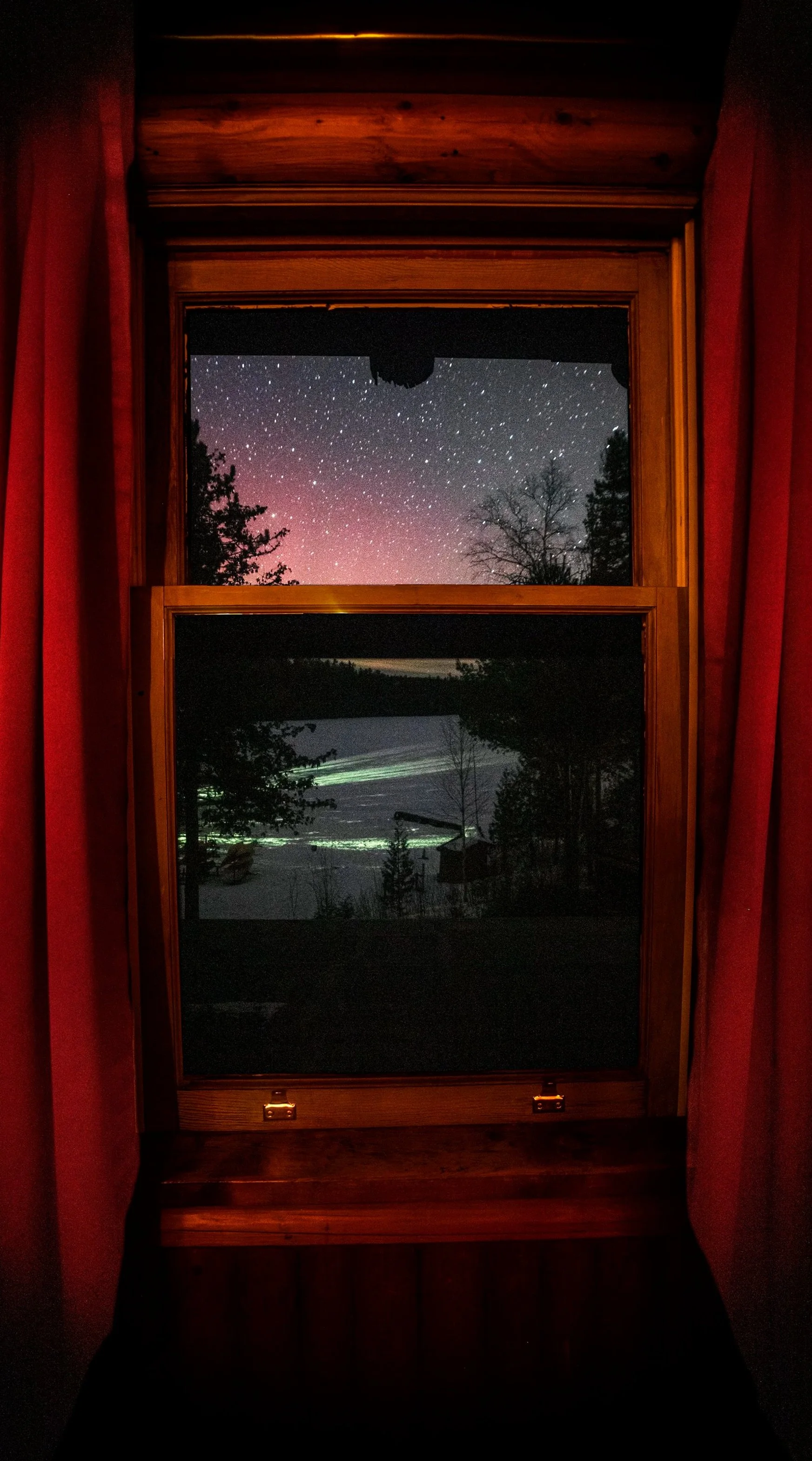 Upstairs in the old lodge, tucked behind heavy red curtains and warm pine walls, this single bedroom holds one of the quietest views on the Gunflint. For nearly a century, this window has framed the same sweep of lake, sky, and forest—watching seasons shift and stars return.