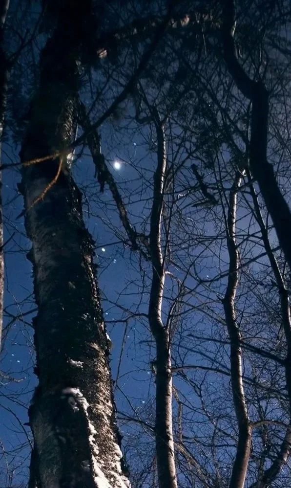 No footsteps lead to the door. No smoke curls from the chimney. And yet—a single light burns against the deep hush of snow and birch. This is my summer cabin, asleep under a roof of stars and silence, nestled in the woods above Clearwater Lake.