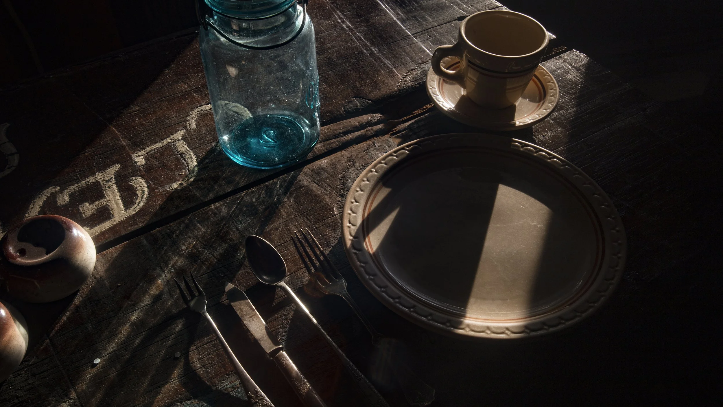 The silverware beside them tells an even older story. The pieces appear to span the late Victorian and early twentieth century (circa 1890–1930), when ornate floral patterns and early Art-Deco shapes were common in American silverplate. Like many working lodges of the Northwoods, table settings were often a mixture—pieces replaced over time but kept in service for decades.